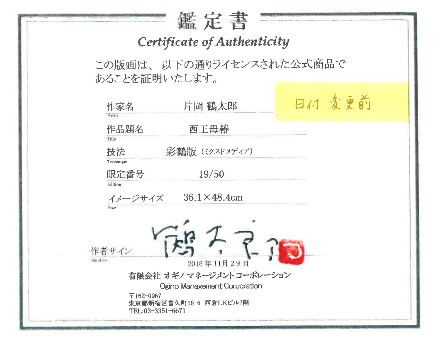 貴方だけのシリアル番号と直筆のサイン・落款が入ります。限定50枚のみの生産。完売次第終了となります。